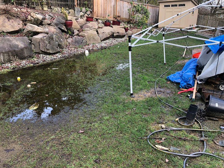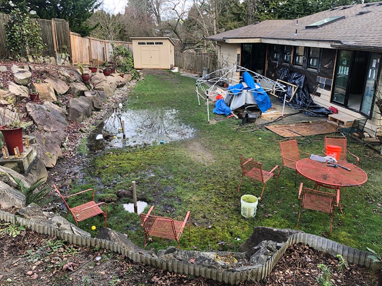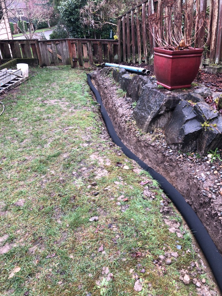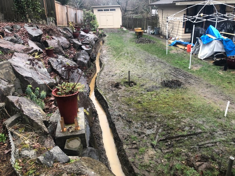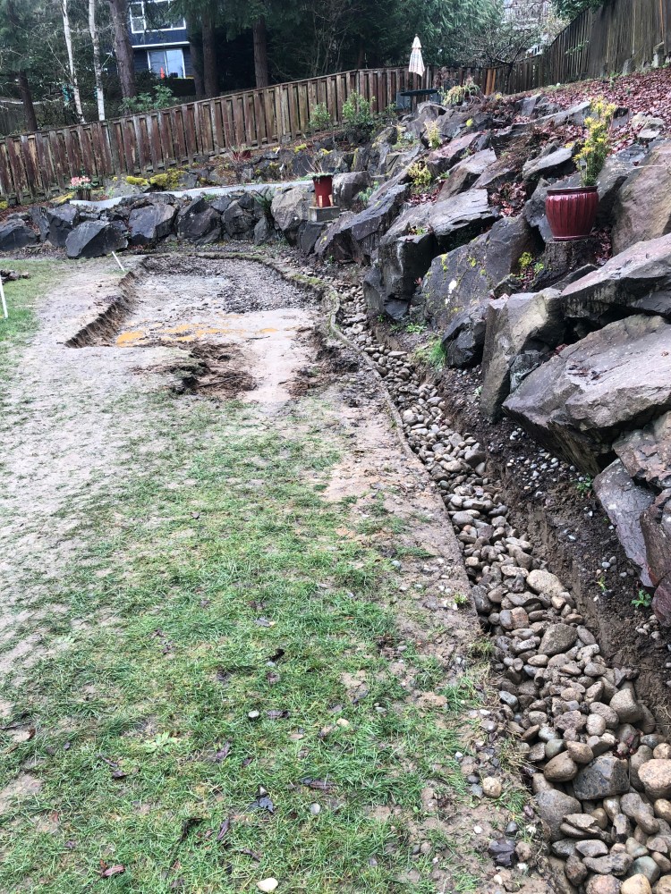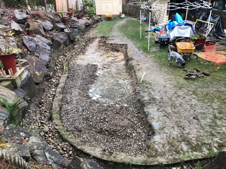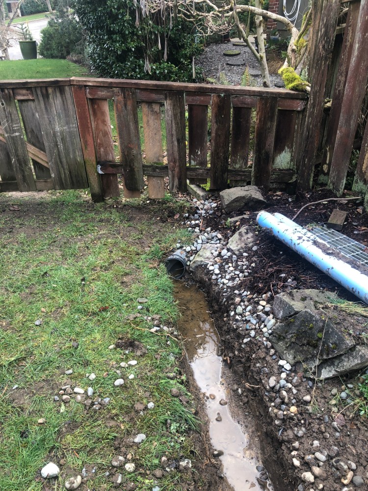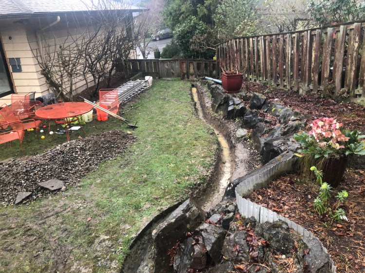 The backyard is all clay soil and doesn’t drain well. With all the rain we’ve had this winter, we’ve had standing water in a lot of the back for over two months. A crew came in on Thursday, March 4th and started work on the project, first being to dig a trench along the rockery perimeter. They put a French drain in that, that will meet up with the French drain pipe at the front fence and connects with the city main. We also had them remove a large area of the back yard down about 14 inches of the thick, blue clay. They replaced that with river rock, then about two-three inches of better-draining topsoil, and then they spread mulch with grass seed. All done by Monday the 8th.